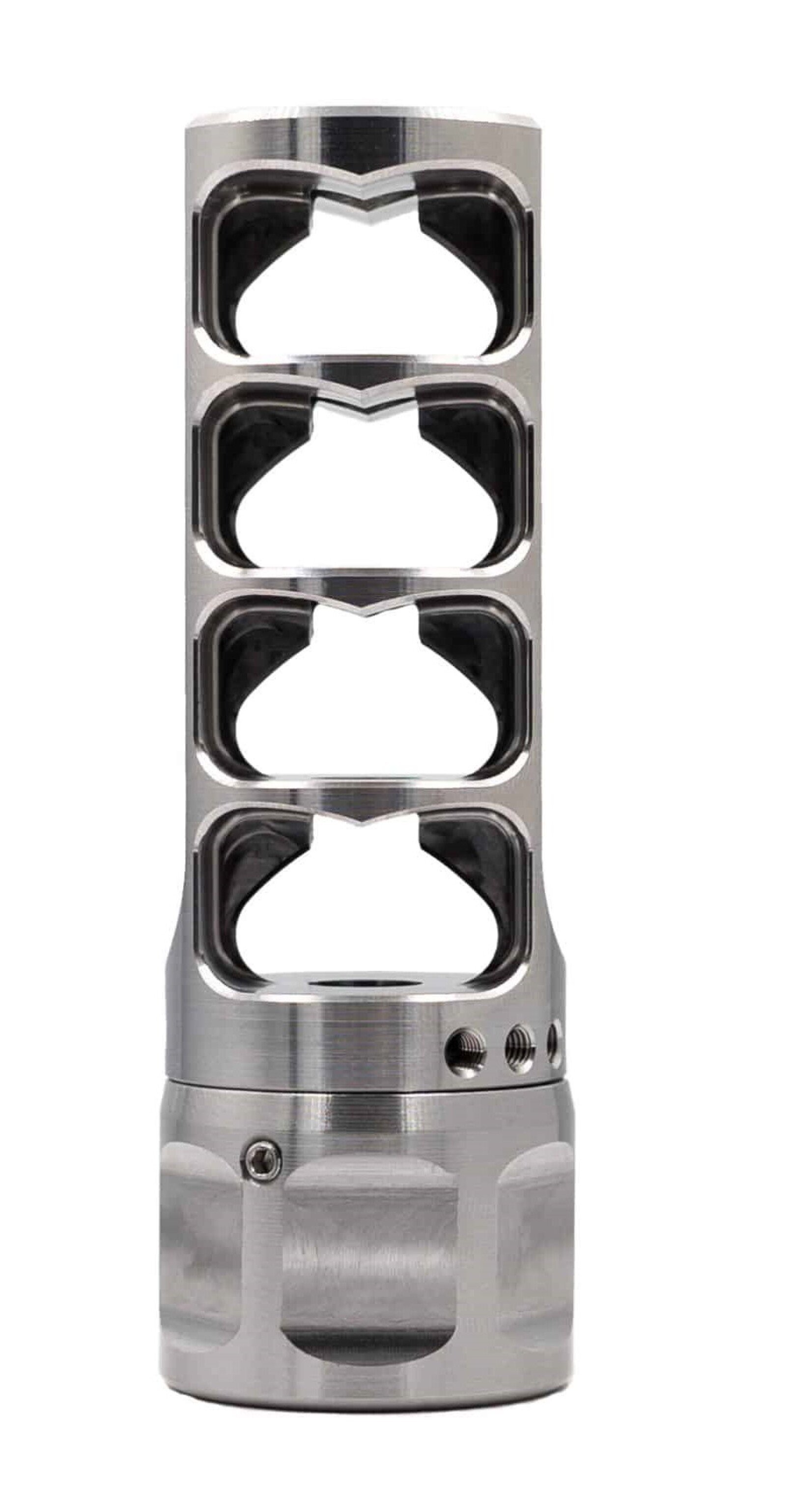 Die Vulcan Bremse hat gerade Ports, die den Rückstoß signifikant reduzieren und damit den Schießkomfort deutlich erhöhen. Zusätzlich kann die Bremse mit sieben einstellbaren Kompensator-Ports aufwarten, die vor den Hauptkammern positioniert sind und so den Hochschlag der Mündung fein einstellbar bremsen können.
