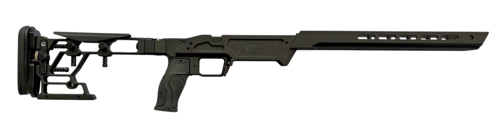 Das LRC Chassis von GS-Stocks setzt neue Maßstäbe in deutscher Ingenieurskunst. Der GS-Stocks PRS-Hinterschaft ist voll in der Länge, Höhe, Seite und Neigung einstellbar. Sichere Fixierung der Einstellungen durch gebohrte Führungsstäbe, ein Verrutschen der Verstellung ist nicht möglich. Integrierte Sandsackauflage, Aufnahmebohrungen für M-LOK Picatinny-Schienen, z.B. zur Montage eines Monopods. Hochfestes, serienmäßig verbautes Klappgelenk mit einstellbarer Spannung, kann um 180° gedreht werden. Aufgrund der Konstruktion wird der Rückstoß absolut linear nach hinten in die Schulter abgeleitet. Integrierte Wasserwaage in der Base. Der Magazinauslöser ist einstellbar, so dass die Magazine immer in der richtigen Höhe sitzen. Der flache Vorderschaft bietet mit seinem Profil eine optimale Auflagefläche. Durchgehende ARCA Schiene und M-LOK Slots an allen Seiten. Gefertigt aus hochfestem 6061-T6 Aluminium mit Harteloxal-Finish. Gesamtgewicht 2,2 kg Das Chassis wird komplett mit Hinterschaft, Base, Vorderschaft und Pistolengriff geliefert, die nötige Hardware ist inklusive. Sonderfarben sind möglich (Cerakote), Standardfarben +150 EUR.