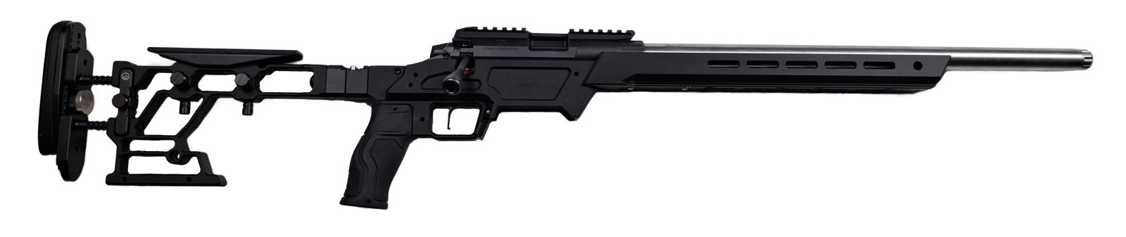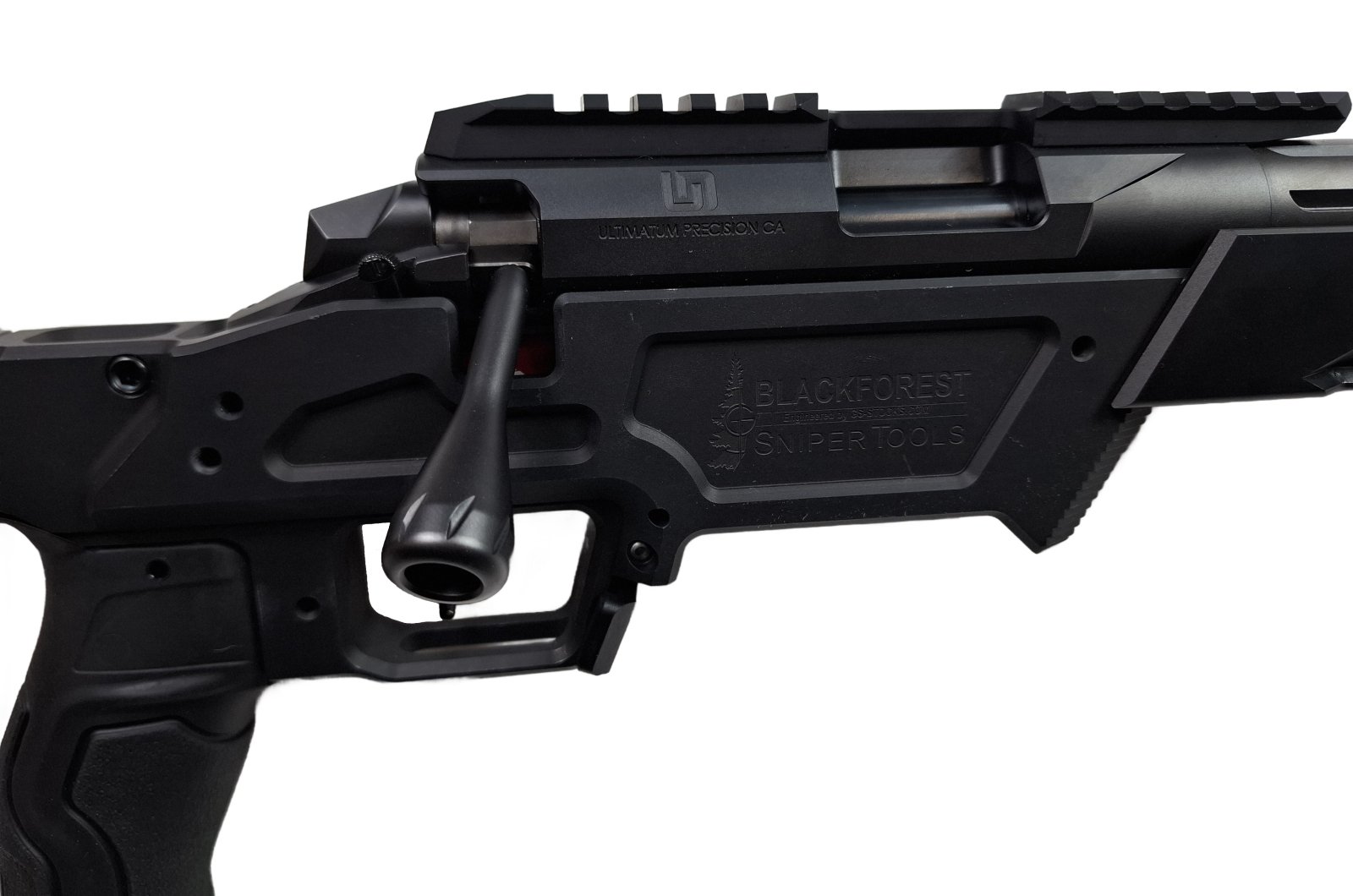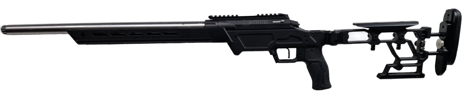 Fullsize Kleinkaliber Matchbüchse von Ultimatum Precision. Die Deuce Gen.1 war lange Zeit bei PRS Rimfire Matches in Übersee immer vorne mit dabei, und auch Treffer auf unglaubliche 600m sind mit der Deuce machbar. Inzwischen ist die zweite Generation dieses Top Kleinkalibersystems auf dem Markt, die ein paar veränderte Winkel, einen etwas leichteren Spannvorgang und größere Auszieherkrallen aufweist.